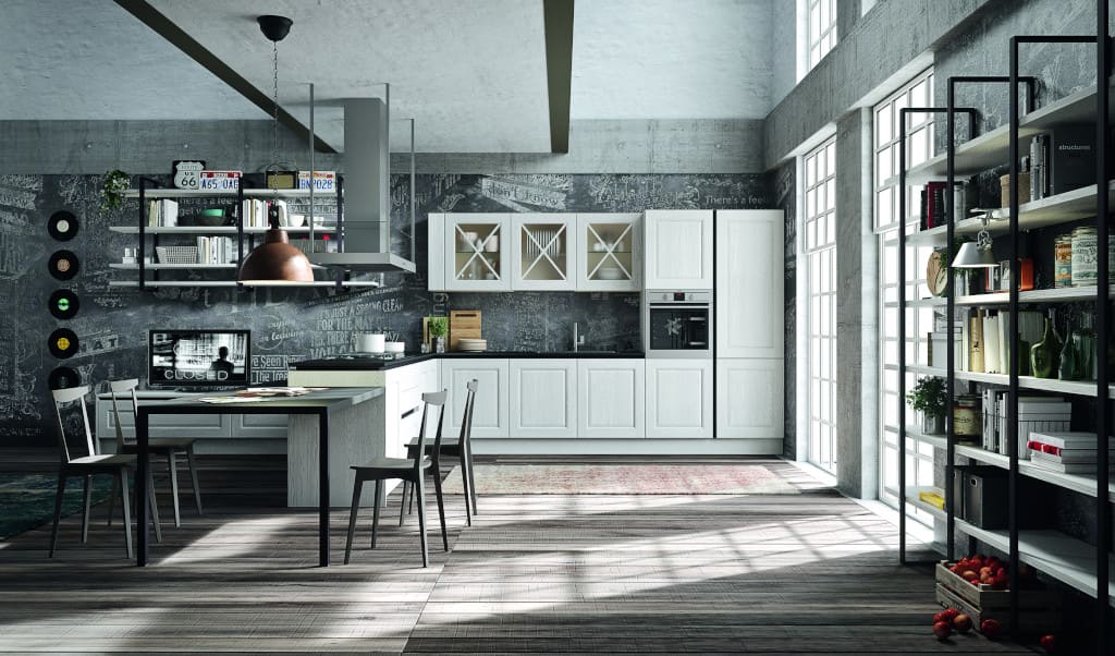 Le grandi superfici in primo piano delle cucine Bellagio Paviasi ispirano ad uno stile di gusto tradizionale a cui è possibile abbinare ante in frassino decapé o, al contrario, componenti dalle note metropolitane per un’atmosfera più moderna e contemporanea.